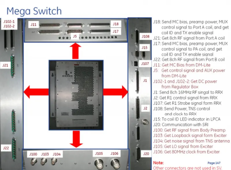 SRI-communicatie (J20): Maakt gegevensuitwisseling mogelijk met SRI Externe signaalingangen (J100, J103-J106): Ontvang RF-signalen van de lichaamsvoorversterker, loopback-signalen van de Exciter, ruissignalen van de TNS-antenne, LO-signalen en 80 MHz klok van de Exciter